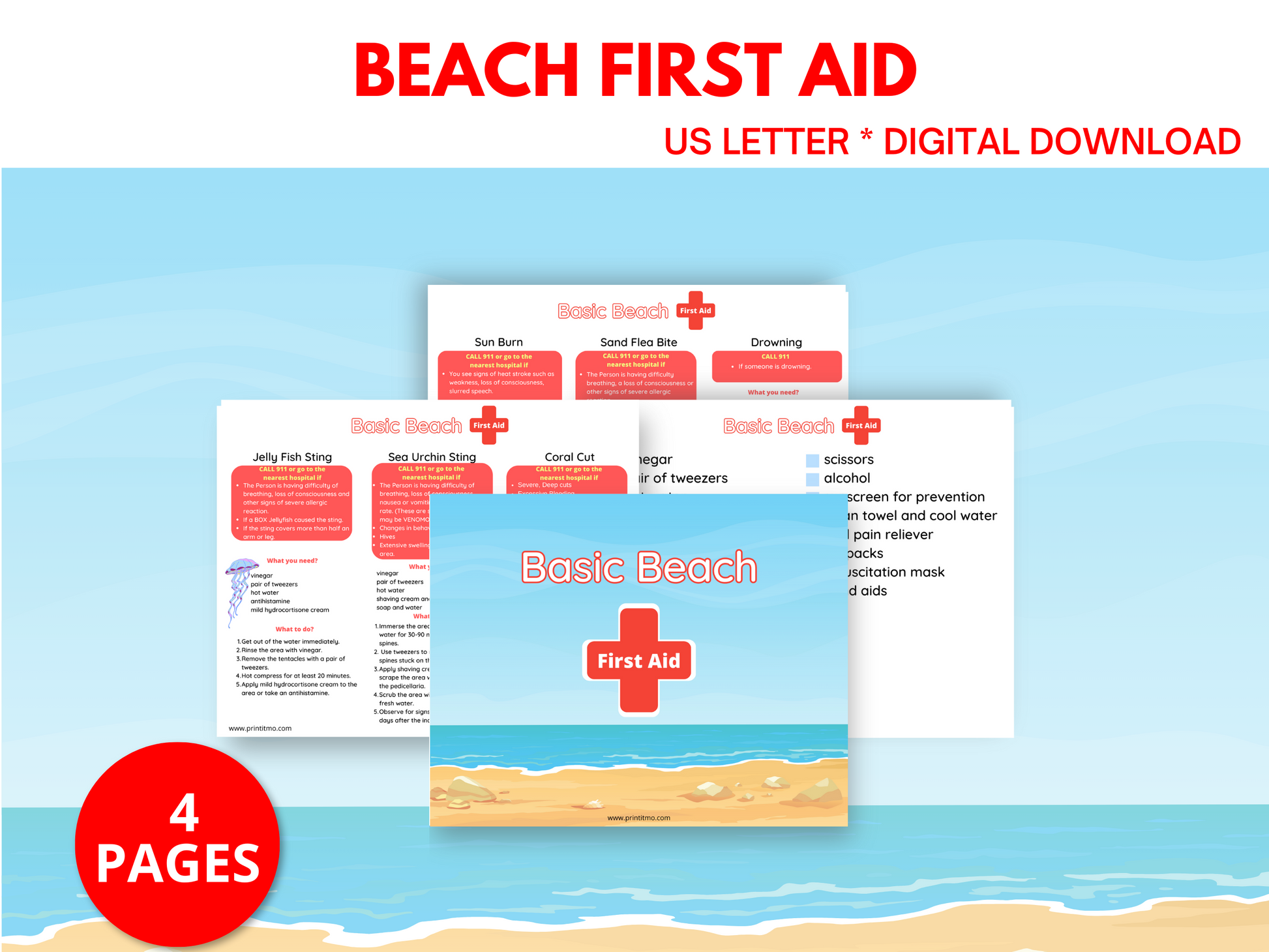 Have fun and stay safe on the beach with this printable first aid. Know what to do for stings, cuts, and all the supplies you need while at the beach.
