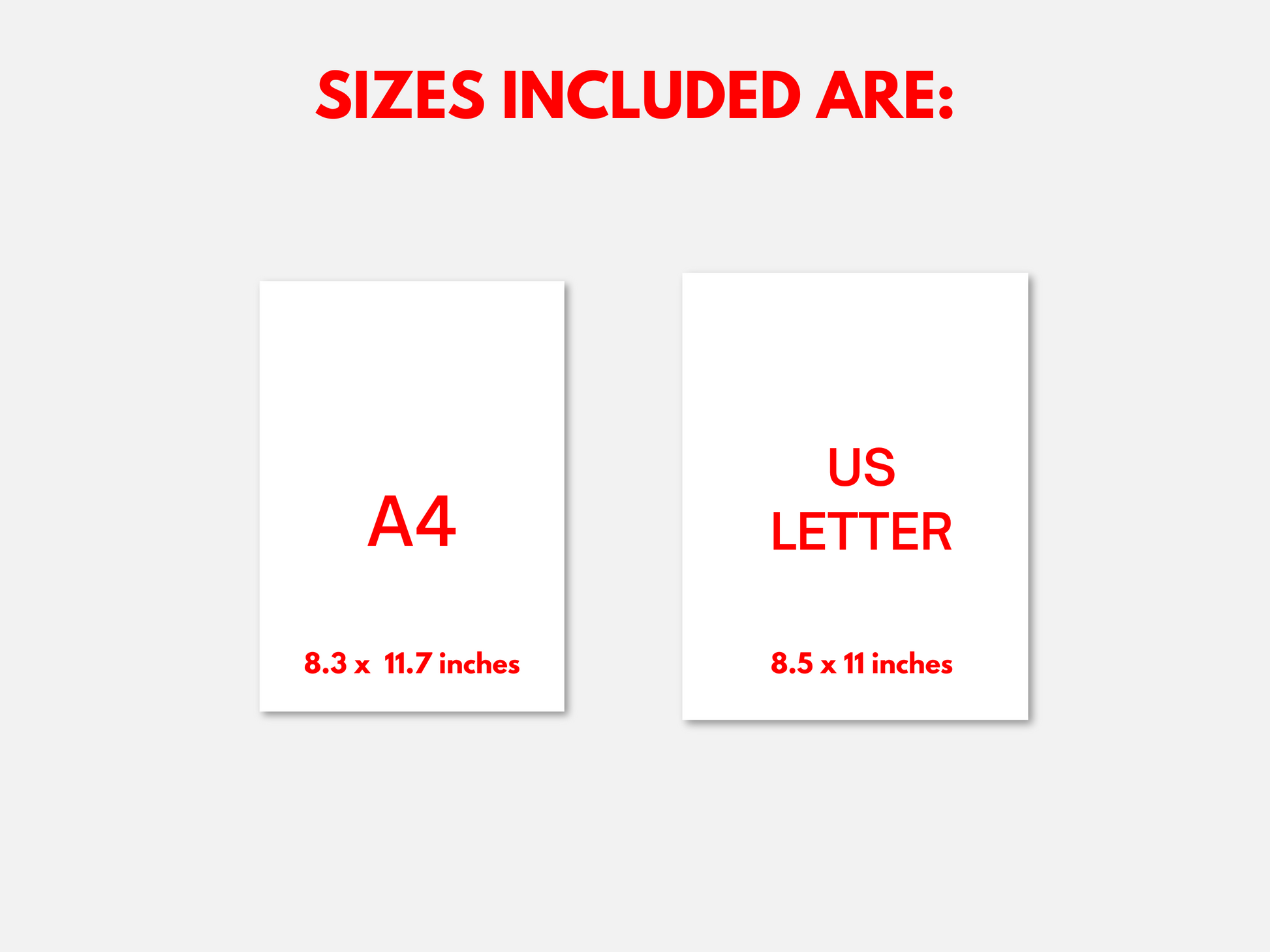 Two PDF files containing 41 pages. This product comes as one 8.5" x 11" US Letter size and one "8.3 x 11.7" A4 size PDF.