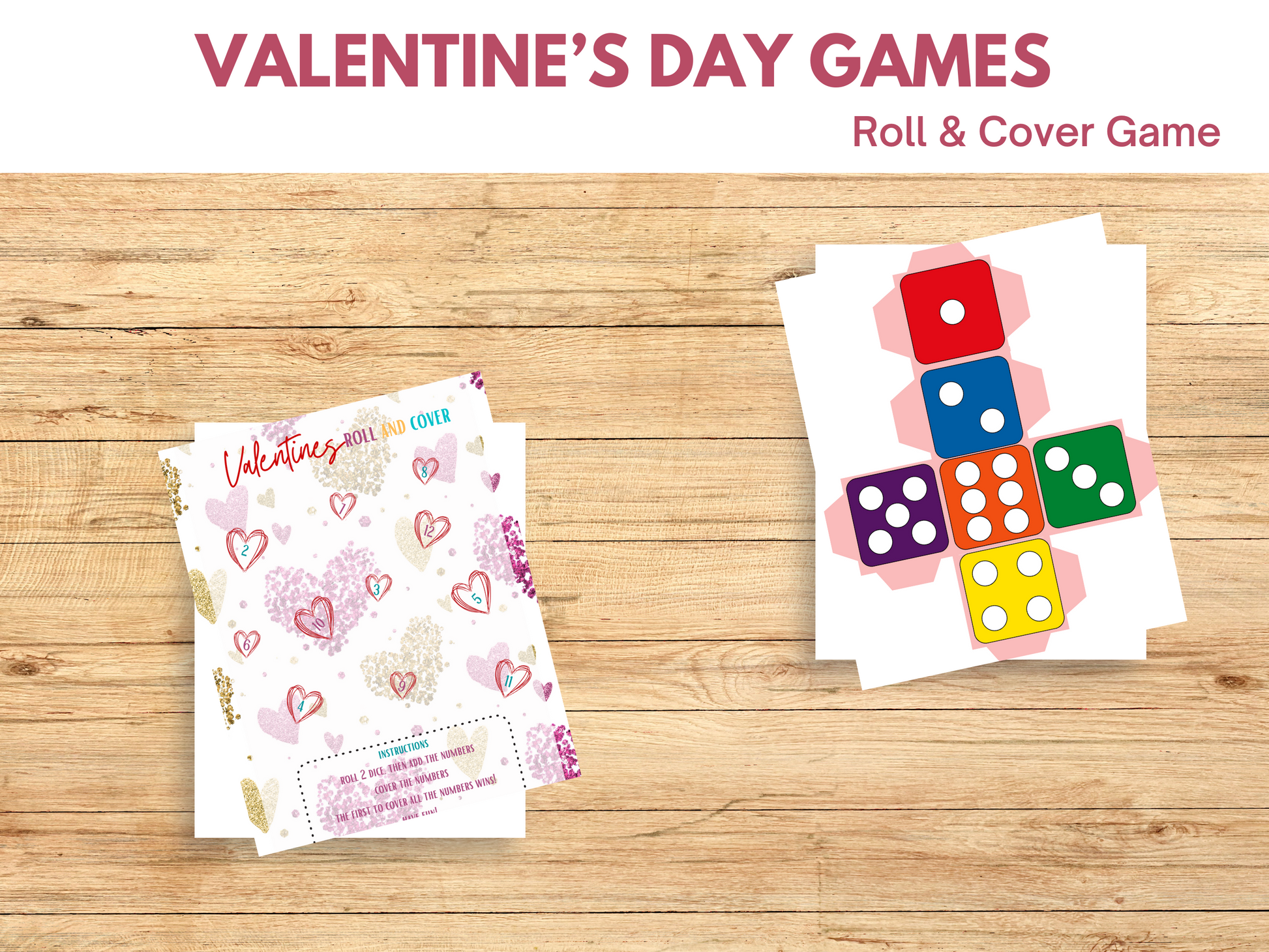 The Happy Valentine's Day printable word search is filled with Valentine-related words like "love," "cupid," or "heart." It's an interactive activity that helps improve vocabulary while having fun searching for hidden words amidst the jumble of letters. Last, they all can play a game of Roll and Cover. Enjoy this instant digital download of Valentine's Day printable games.
